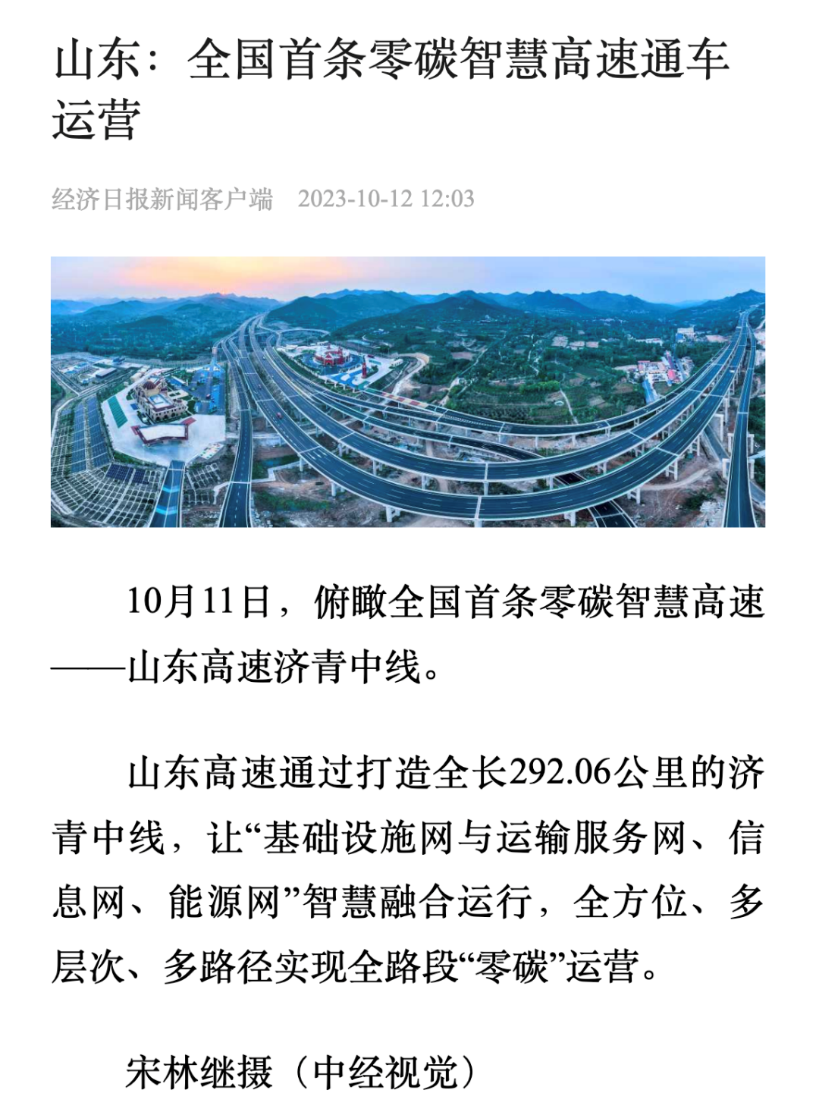 2023-10-12山東高速通過打造全長292.06公里的濟青中線,讓“基礎設施網與運輸服務網、信息網、能源網”智慧融合運行,全方位、多層次、多路徑實現全路段“零碳”運營。