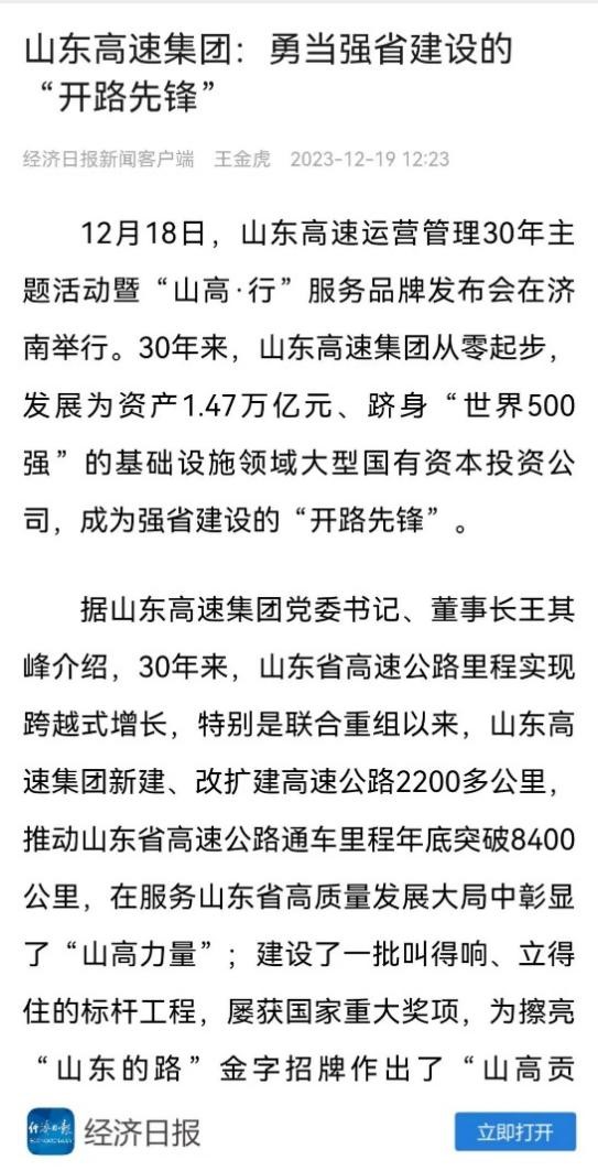 2023-12-1912月18日,山東高速運(yùn)營(yíng)管理30年主題活動(dòng)暨“山高·行”服務(wù)品牌發(fā)布會(huì)在濟(jì)南舉行。30年來,山東高速集團(tuán)從零起步,發(fā)展為資產(chǎn)1.47萬億元、躋身“世界500強(qiáng)”的基礎(chǔ)設(shè)施領(lǐng)域大型國(guó)有資本投資公司,成為強(qiáng)省建設(shè)的“開路先鋒”。