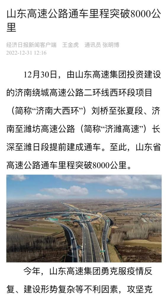 2023-12-3112月30日,由山東高速集團投資建設的濟南繞城高速公路二環線西環段項目(簡稱“濟南大西環”)劉橋至張夏段、濟南至濰坊高速公路(簡稱“濟濰高速”)長深至濰日段提前建成通車。至此,山東省高速公路通車里程突破8000公里。